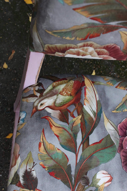 Verhoilin tuolin ihanan hehkuvalla Jakobsdalin kukkasametilla. Lopulta monien vertailujen jälkeen valitsin tumman lilan nauhan reunustamaan istuimen reunaa.